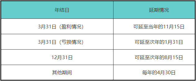 通常来说,香港公司的财政年度为12个月(新成立的公司第一年能够自动延至18个月,因为已经自动延期3个月,所以不能再申请延期),其后每年依照不同年结日,香港税务局允许延期递交税表。如下: